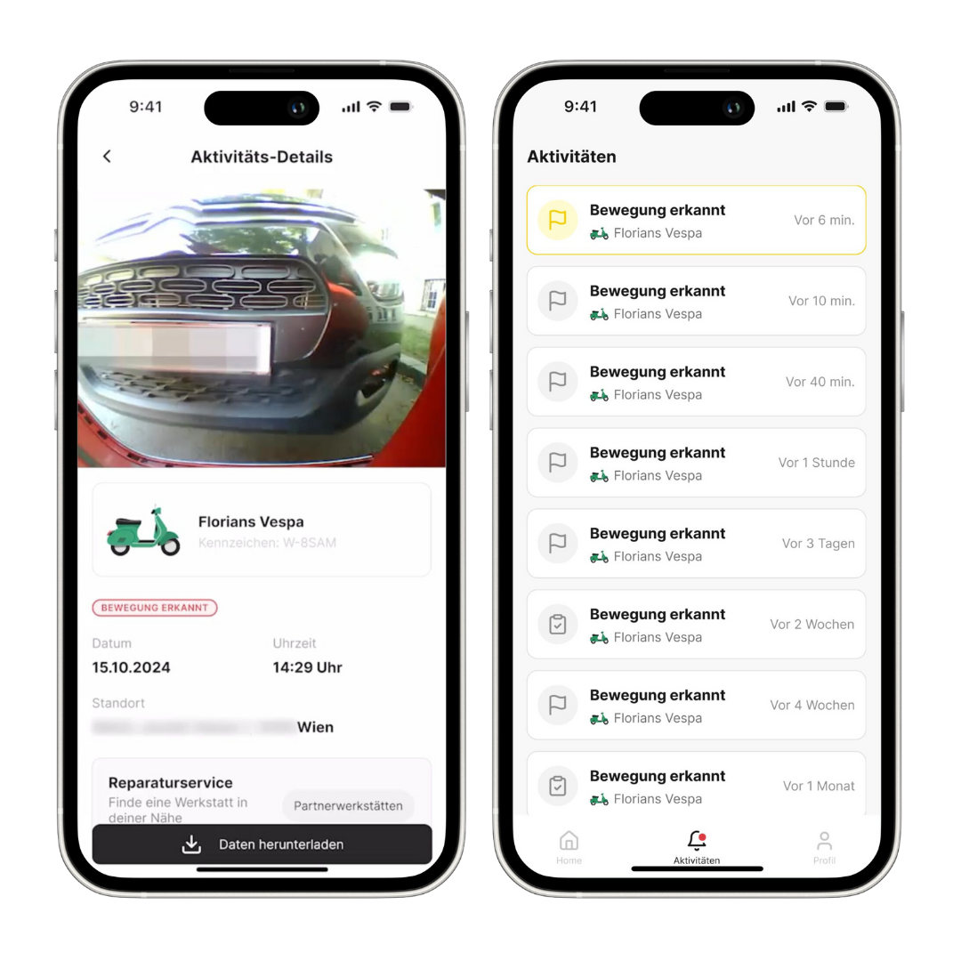 Wird dein Roller beschädigt oder bewegt, bekommst du sofort eine Echtzeitbenachrichtigung per App, SMS, Email – inkl. Video, Zeitstempel und GPS-Standort.